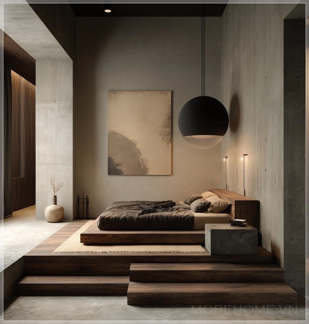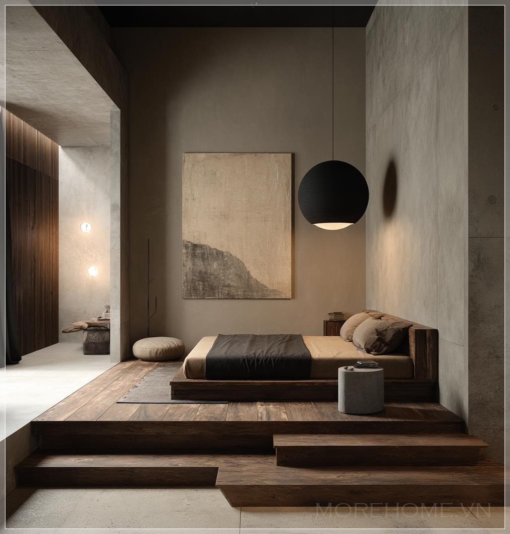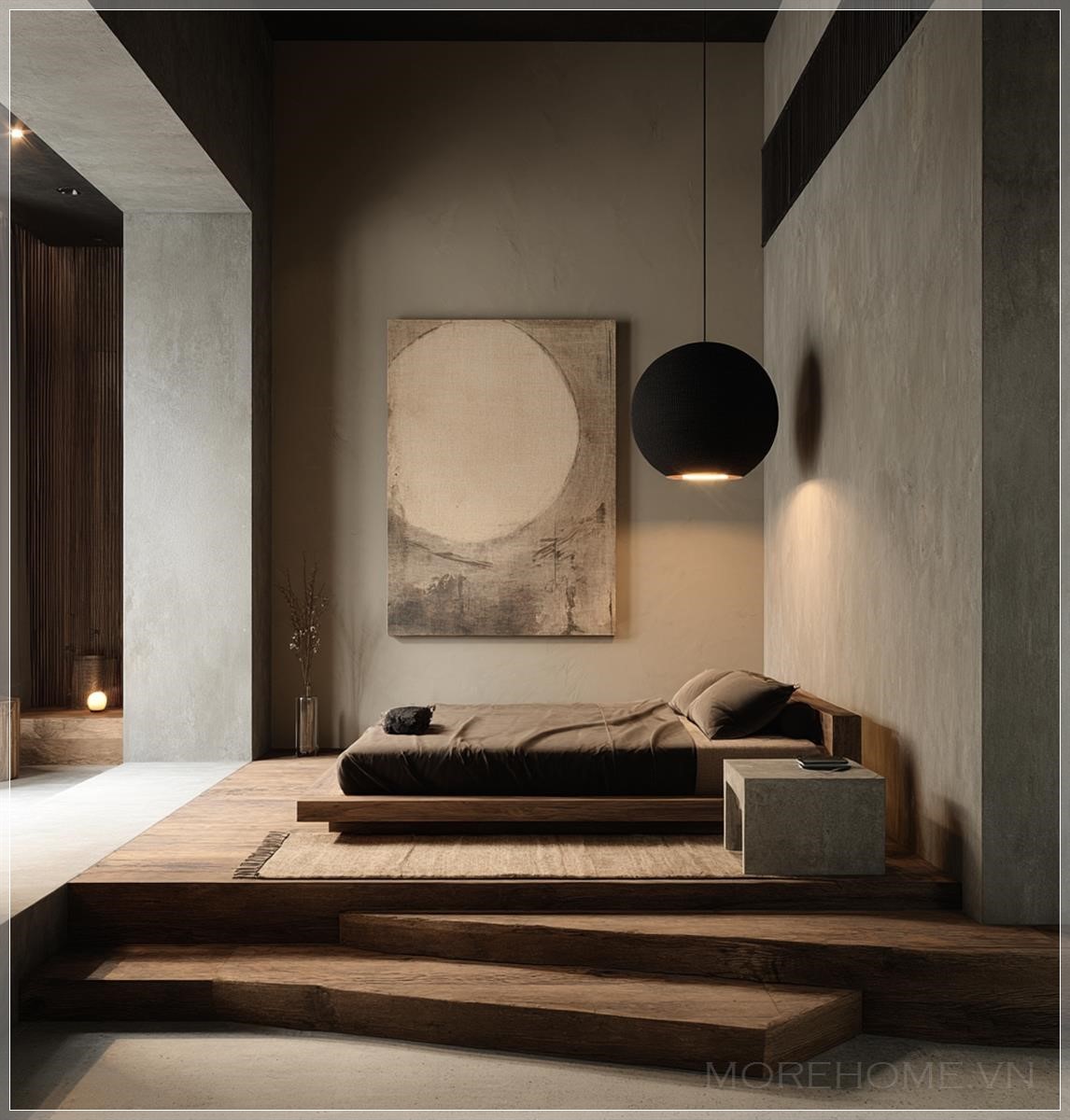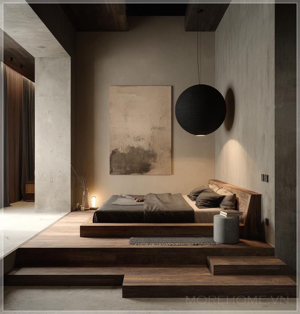 Chiếc giường như được treo lơ lửng trên nền tảng gỗ tự nhiên, tạo nên cảm giác nhẹ nhàng và thanh thoát. Những bậc thang nhỏ dẫn lên không chỉ có tính năng thực tiễn mà còn mang đến cảm giác ritual thiêng liêng khi bước vào vùng đất riêng tư nhất của bản thân. Đây không đơn thuần là một chiếc giường, mà như một bệ thờ dành riêng cho giấc ngủ - nơi mà con người tìm lại sự cân bằng sau những ngày dài bận rộn.