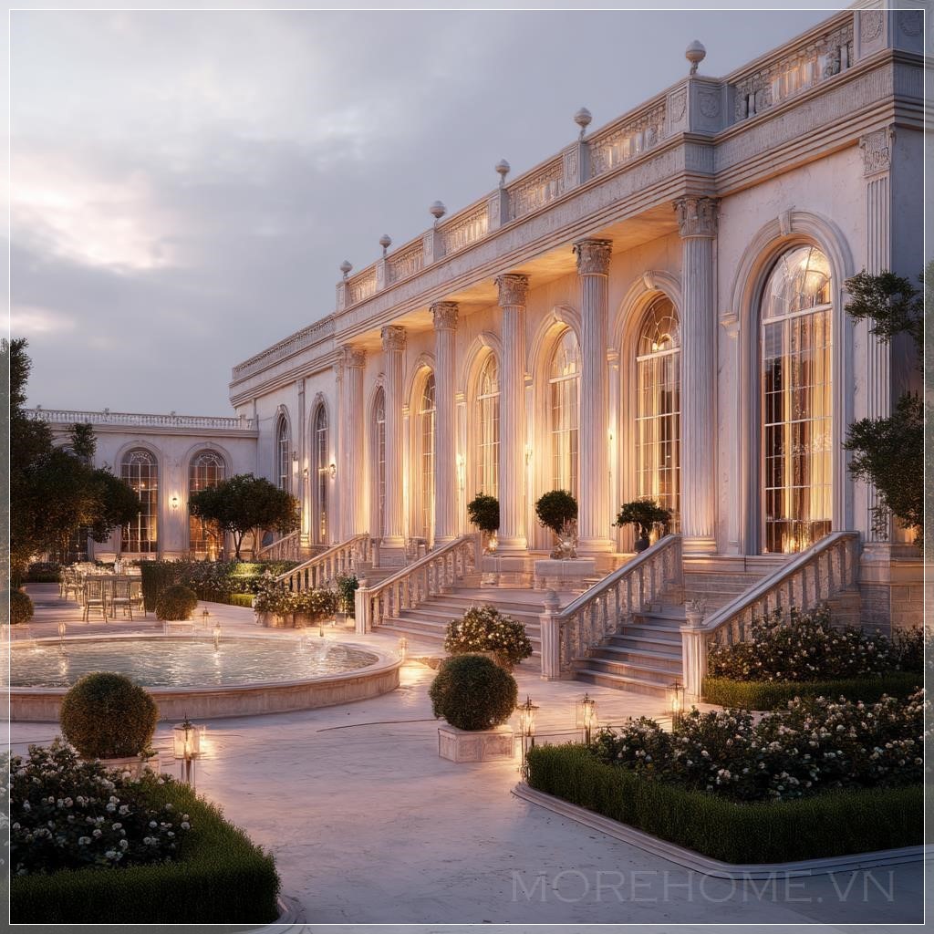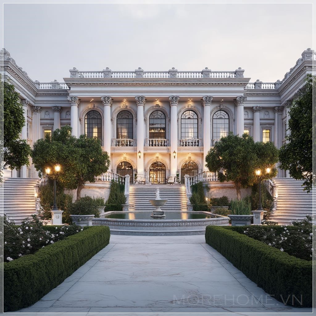Hai cầu thang đá rộng rãi đối xứng hai bên tòa nhà như những cánh tay mở rộng chào đón những vị khách quý. Mỗi bậc thang được đục gọt tinh xảo, dẫn lối đến khu vườn cổ điển trên mái với những hàng rào cắt tỉa đều tăm tắp và lan can đá sang trọng. Đây chính là nơi các cặp đôi có thể tận hưởng những khoảnh khắc riêng tư giữa khung cảnh thơ mộng, nơi tình yêu được nuôi dưỡng bởi vẻ đẹp vượt thời gian.