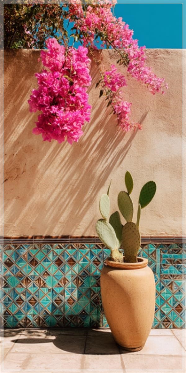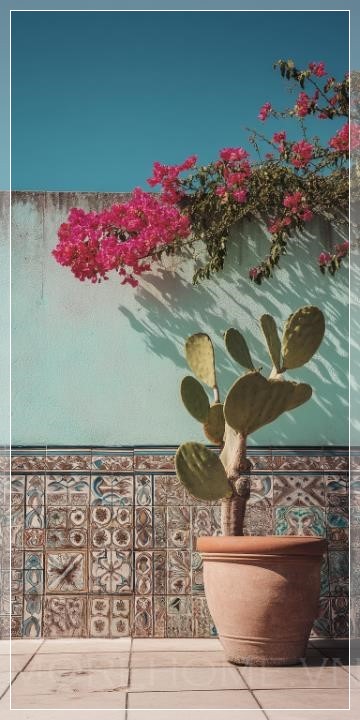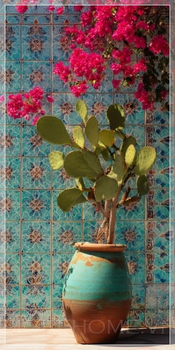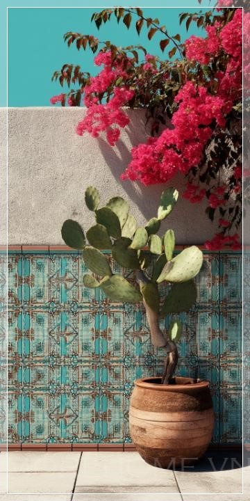 Màu xanh ngọc lam của những chiếc lá dày, mọng nước tương phản tuyệt đẹp với tông màu ấm áp của bức tường phía sau. Những viên gạch Mexico với họa tiết hình học tinh xảo, chuyển mình qua các sắc độ từ xanh biển sâu thẳm đến be nhẹ nhàng, rồi nâu đất trầm ấm, tạo nên một bức tranh đầy sức sống. Mỗi viên gạch là một câu chuyện, mỗi đường nét hình học là một lời thì thầm về văn hóa xa xưa nhưng vẫn mãi tươi mới.