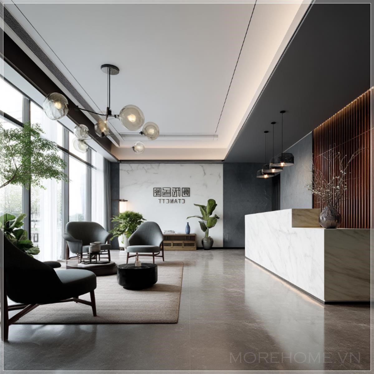 Khi bước vào không gian làm việc được trang trí theo phong cách Minh triều, điều đầu tiên thu hút ánh nhìn chính là quầy lễ tân được đặt ở vị trí trung tâm, với góc nhìn thẳng 90 độ tạo nên sự cân đối hoàn hảo. Thiết kế này không chỉ đảm bảo tính thực tiễn trong việc đón tiếp khách hàng mà còn tôn lên vẻ đẹp kiến trúc cổ điển Á Đông.