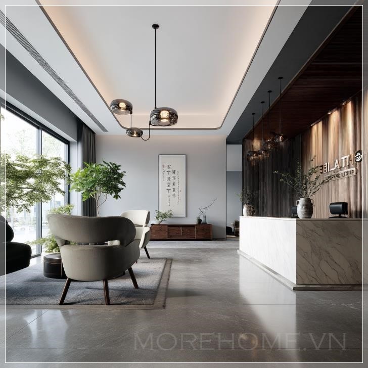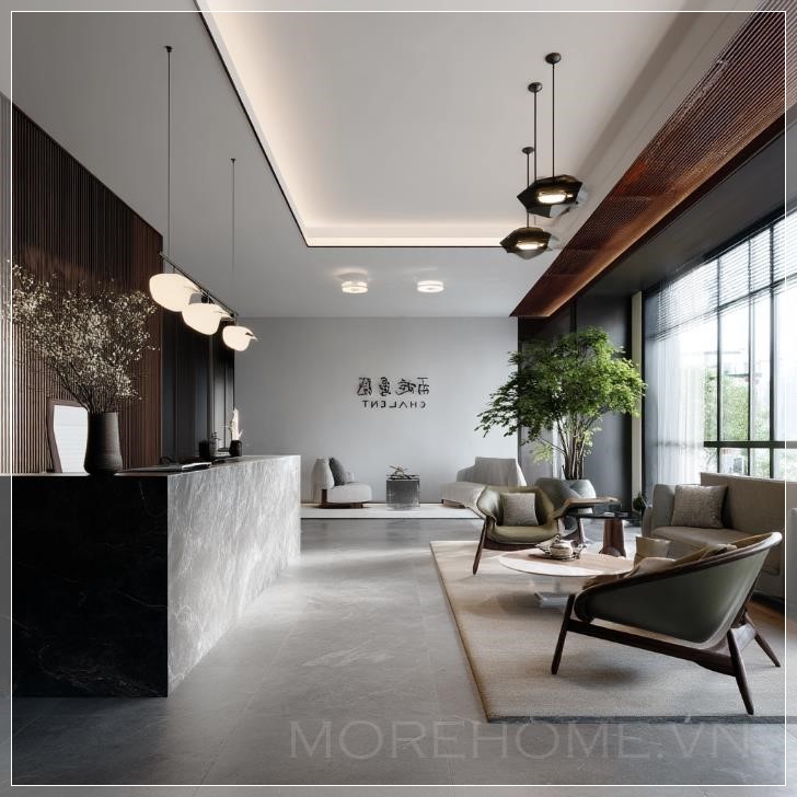 Không gian xung quanh quầy lễ tân cũng được chăm chút kỹ lưỡng với những chi tiết như bình hoa gốm sứ, tranh thư pháp, hoặc một số tác phẩm nghệ thuật nhỏ mang đậm dấu ấn văn hóa Á Đông. Những yếu tố này không chỉ làm đẹp cho không gian mà còn tạo ra những điểm nhấn thú vị, khuyến khích sự tương tác và trò chuyện tự nhiên.