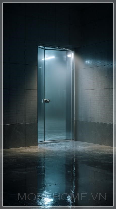 Đặc biệt ấn tượng là hệ thống đèn LED tích hợp dọc theo viền cửa, tạo nên những đường sáng mềm mại bao quanh khung cửa. Ánh sáng này không chỉ có chức năng thẩm mỹ mà còn mang tính ứng dụng cao, giúp định hướng trong những khoảnh khắc thiếu sáng mà không cần bật đèn chính. Khi màn đêm buông xuống, những đường sáng này biến cánh cửa thành một điểm nhấn nghệ thuật độc đáo, thu hút mọi ánh nhìn.