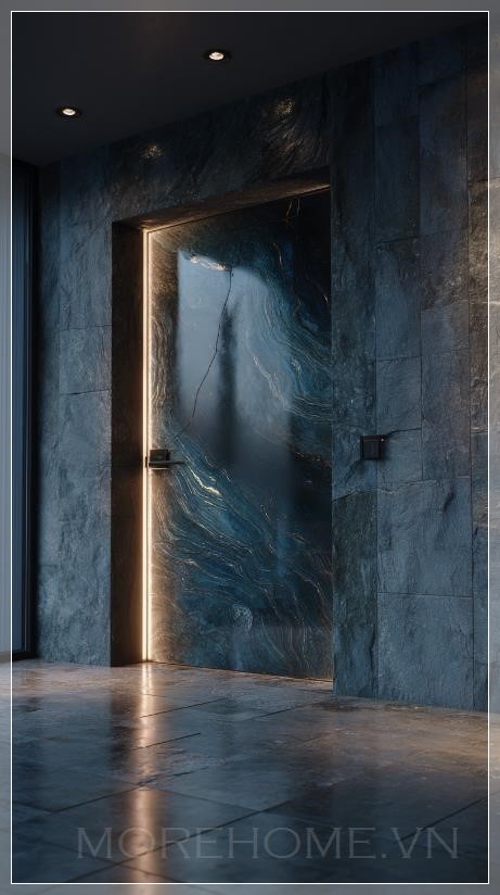 Hãy tưởng tượng bước vào một căn hộ hiện đại tại Paris hay Berlin, nơi ánh sáng nhẹ nhàng tràn qua những tấm kính lớn, và ngay trước mắt bạn là một cánh cửa với sắc đen obsidian huyền bí hòa quyện cùng tông xanh sapphire quyến rũ. Đây không chỉ đơn thuần là một cánh cửa, mà là một tác phẩm nghệ thuật sống động, nơi mà các lớp nhựa resin trong suốt tạo nên những họa tiết xoáy trừu tượng tự nhiên, như những dòng sông thu nhỏ được đóng băng trong thời gian.