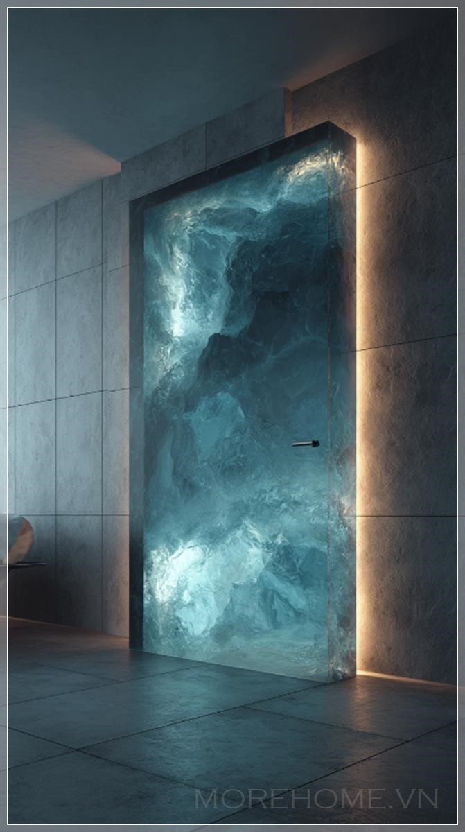 Vẻ đẹp của cánh cửa epoxy resin không chỉ nằm ở màu sắc mà còn ở cách nó tương tác với ánh sáng. Khi những tia sáng gián tiếp từ hệ thống chiếu sáng LED âm trần chiếu xuống, bề mặt nhẵn bóng của cửa trở thành một tấm gương ma thuật, phản chiếu và khúc xạ ánh sáng theo những góc độ khác nhau. Hiệu ứng này tạo ra một cảm giác sâu sắc về không gian, khiến căn phòng trở nên rộng rãi và thoáng đãng hơn so với thực tế.