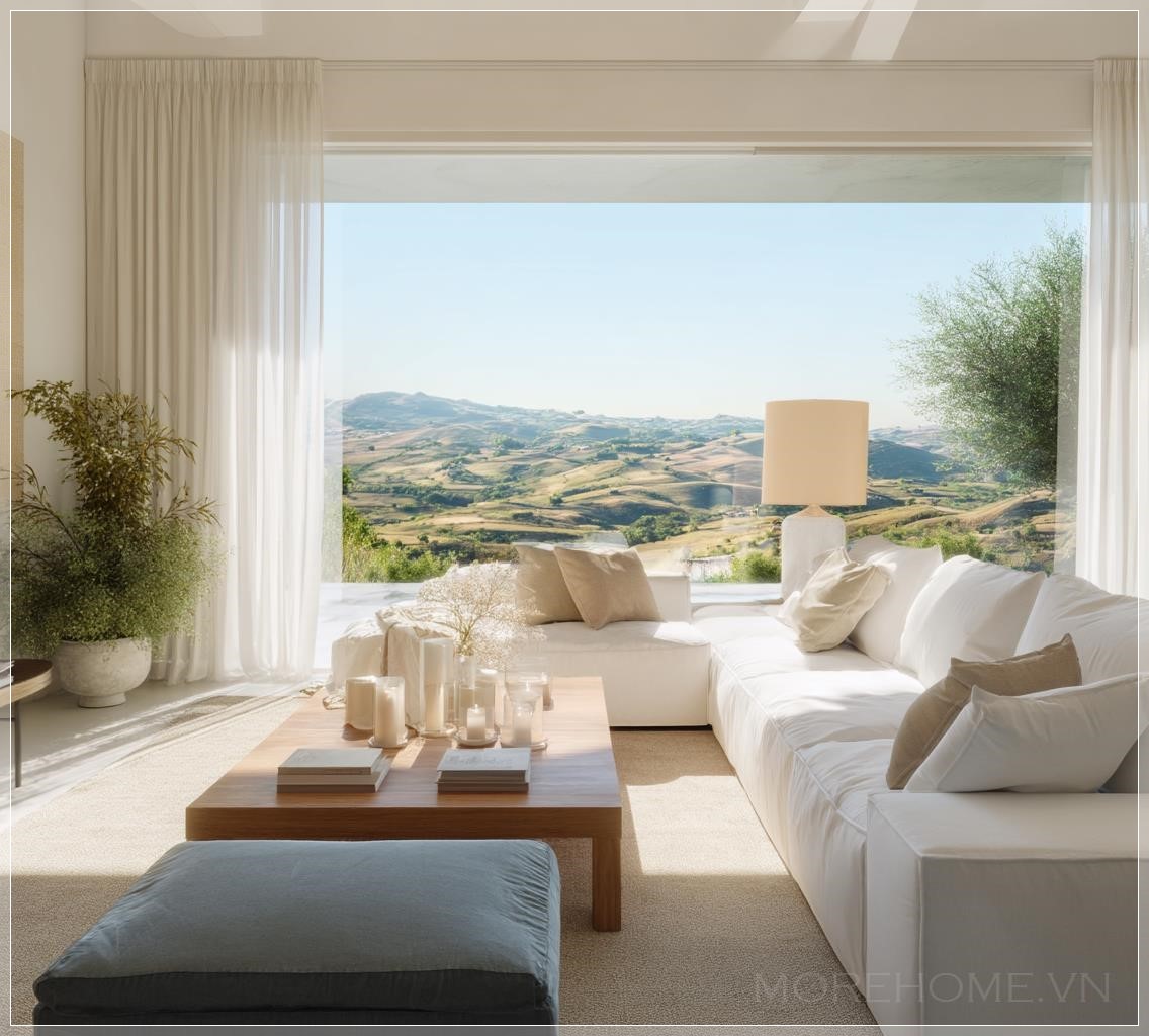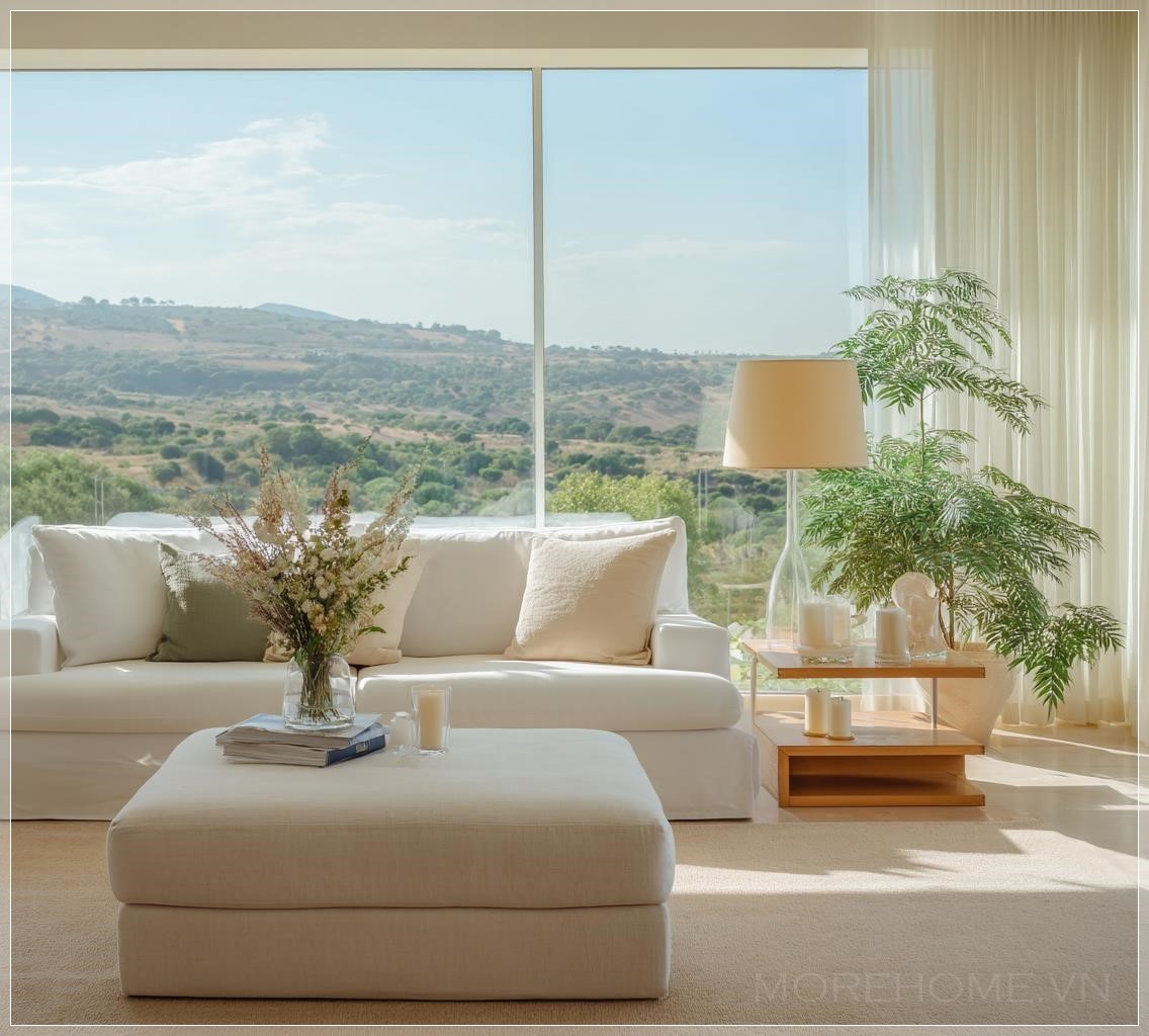 Ánh sáng tự nhiên chan hòa khắp căn phòng khách, tạo nên một bầu không khí thanh bình mà hiếm có không gian nào có thể sánh bằng. Chiếc sofa trắng tinh khôi đặt ở vị trí trung tâm không chỉ là một món đồ nội thất, mà còn là tâm điểm của cả thiết kế, như một tờ giấy trắng đang chờ được vẽ nên những câu chuyện đời thường.
