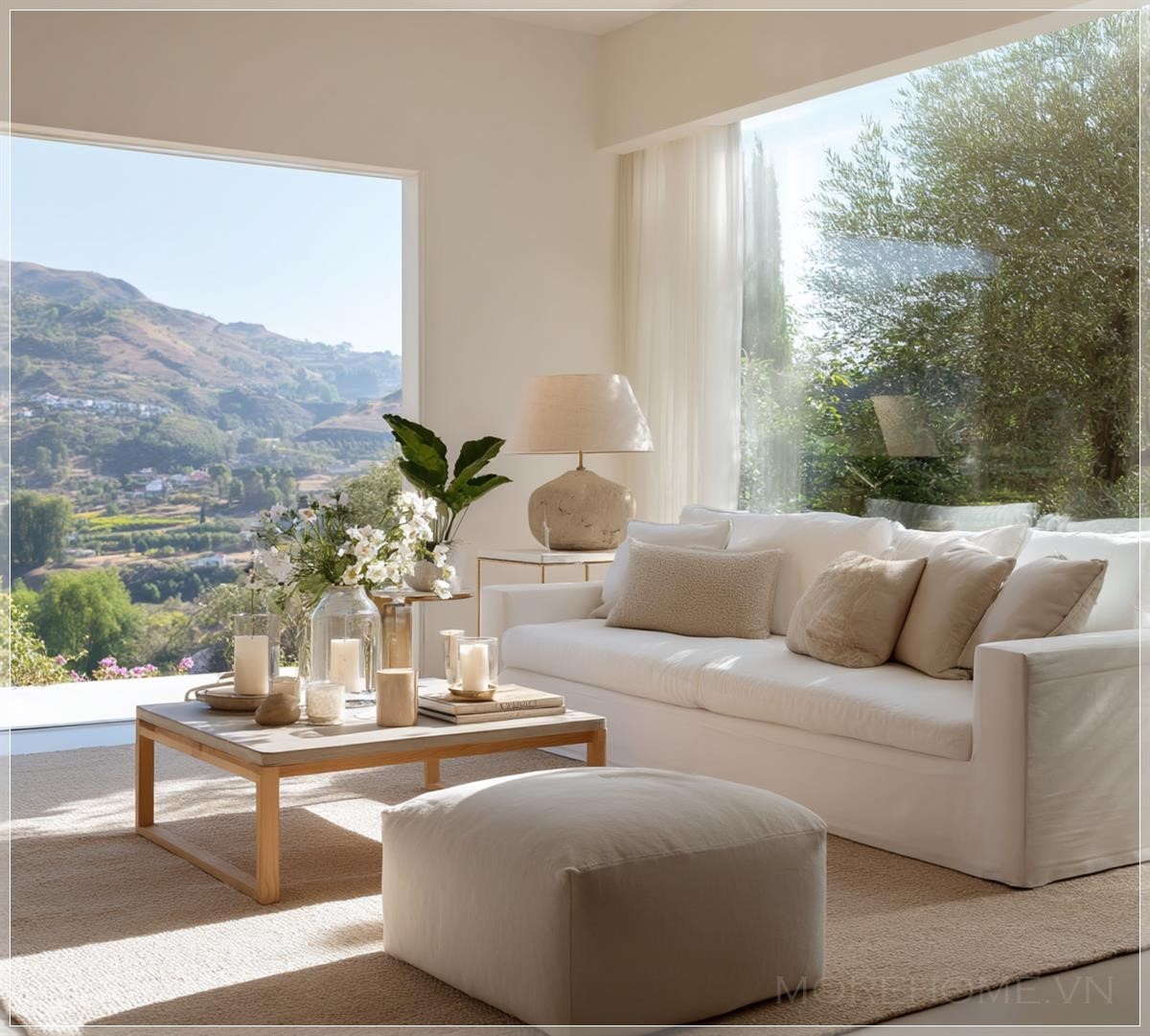 Chiếc bàn ottoman đặt trước sofa vừa có thể làm bàn cà phê, vừa có thể trở thành chỗ để chân thư giãn, thể hiện tính linh hoạt và thực dụng trong thiết kế hiện đại. Đây là minh chứng cho xu hướng nội thất đa năng, phù hợp với lối sống năng động của thời đại.