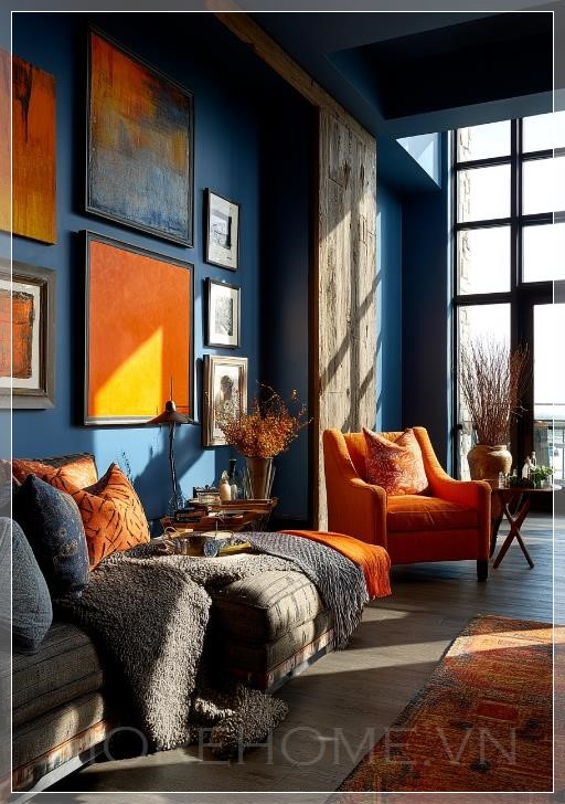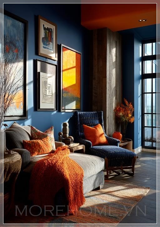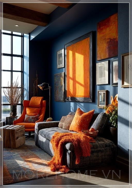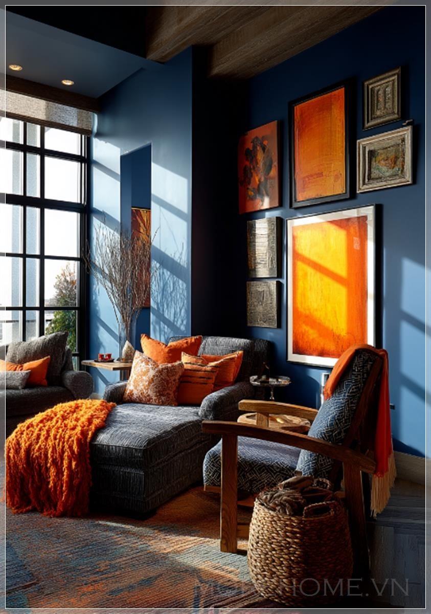 Bảng màu chủ đạo của căn phòng được xây dựng trên nền tảng của hai sắc thái đối lập nhưng lại bổ sung hoàn hảo cho nhau: xanh dương sâu thẳm và cam rực rỡ. Màu xanh dương mang đến cảm giác yên bình, thanh thoát như bầu trời trong xanh, trong khi màu cam lại thổi bừng sức sống, năng lượng tích cực như những tia nắng ấm áp của hoàng hôn. Sự kết hợp này không chỉ tạo ra điểm nhấn thị giác mạnh mẽ mà còn giúp không gian trở nên cân bằng và hài hòa một cách bất ngờ.