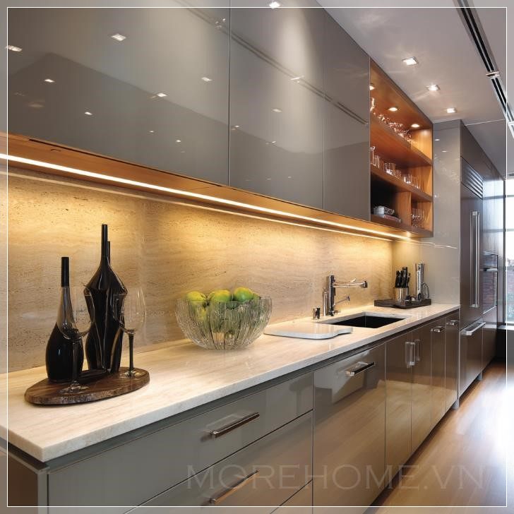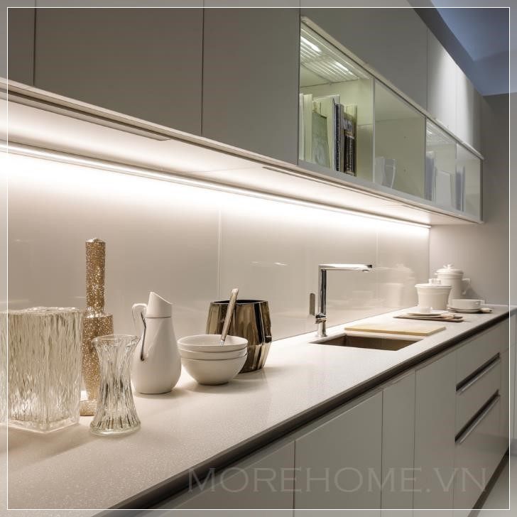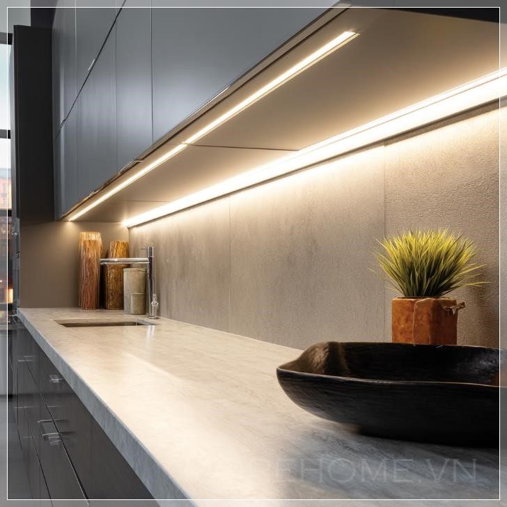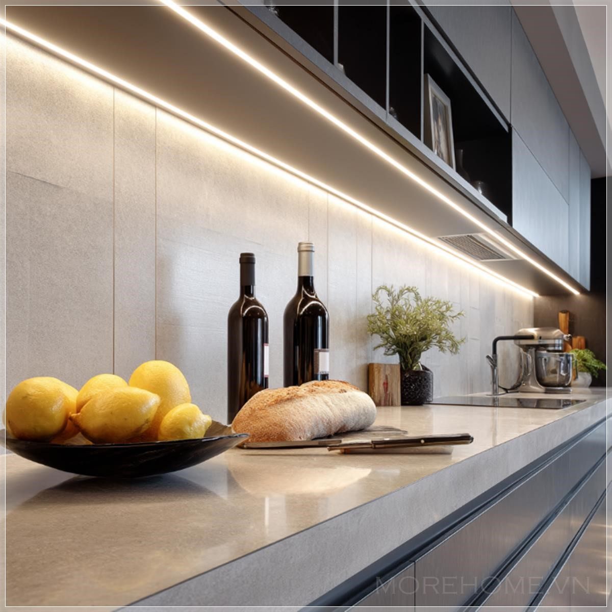 Trong một căn bếp hiện đại, dải đèn LED mượt mà được lắp dưới các tủ trên, phát ra ánh sáng ấm áp nhẹ nhàng trên mặt bàn. Chất liệu nhôm và bộ khuếch tán được sử dụng khéo léo để phân phối ánh sáng đều đặn, làm nổi bật sự cân bằng giữa tính năng và thiết kế. Không gian toát lên vẻ thanh lịch và hiện đại, với sự kết hợp liền mạch giữa các bề mặt bóng loáng và hệ thống chiếu sáng tinh tế, tạo ra một ranh giới đặc biệt nhưng đầy sang trọng trong không gian bếp.