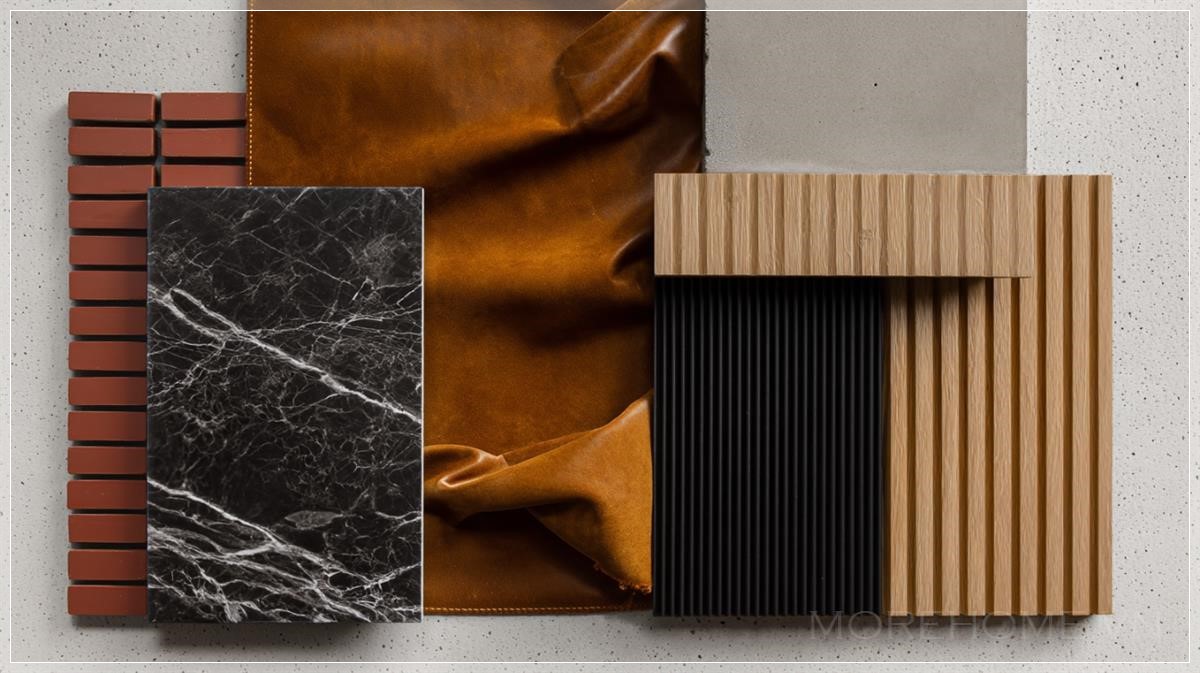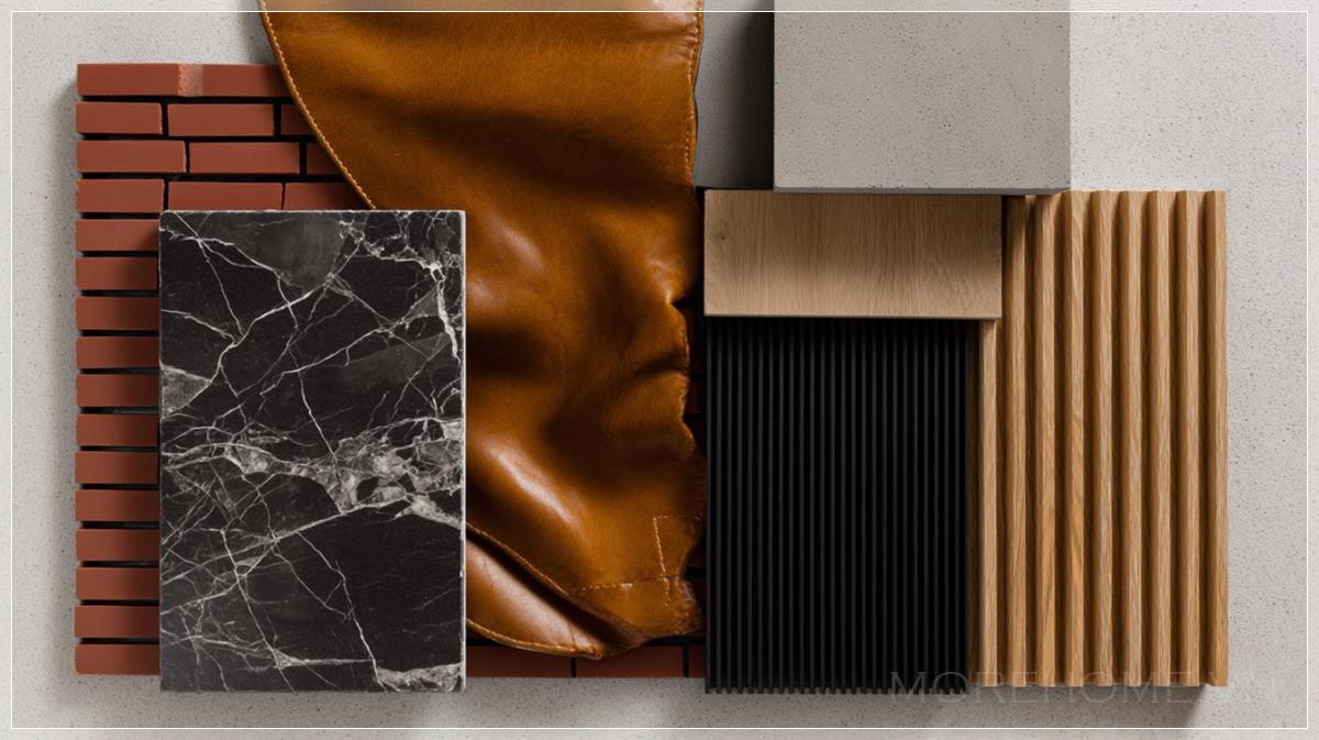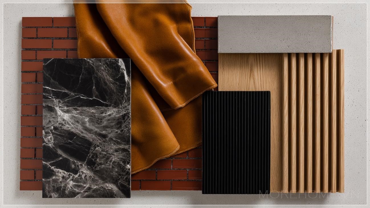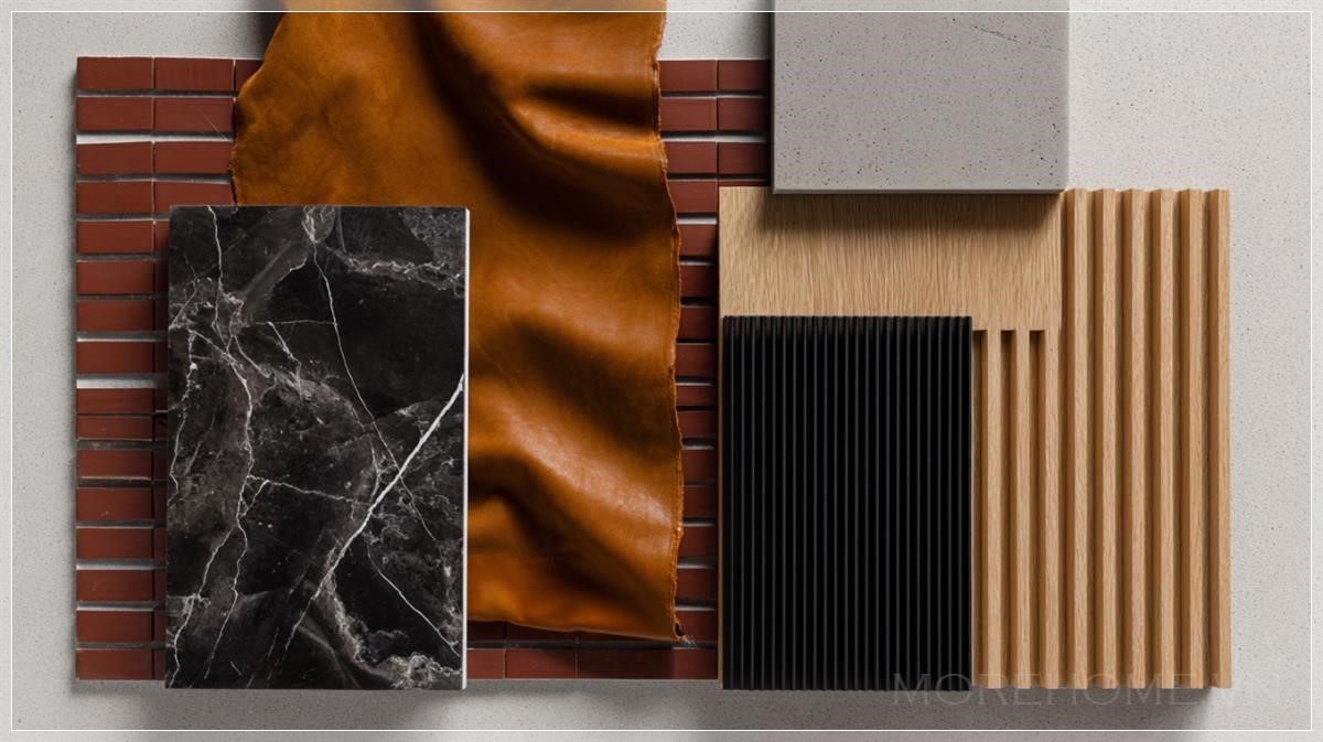 Trong thiết kế nội thất hiện đại, việc lựa chọn vật liệu không chỉ phản ánh phong cách mà còn tạo nên cảm giác riêng biệt cho mỗi không gian. Một bảng moodboard vật liệu cho dự án thiết kế có thể kể một câu chuyện độc đáo, từ cảm giác mạnh mẽ của đá marble đen đến sự ấm áp của gỗ sồi, tất cả tạo nên sự kết hợp hoàn hảo giữa các yếu tố tự nhiên và hiện đại. Sự kết hợp giữa bê tông nhẹ, gỗ sồi có vân rãnh, đá marble đen, gạch đỏ cổ điển, da caramel và các chi tiết kim loại đen là một lựa chọn táo bạo nhưng đầy tính sáng tạo cho không gian sống hay làm việc.