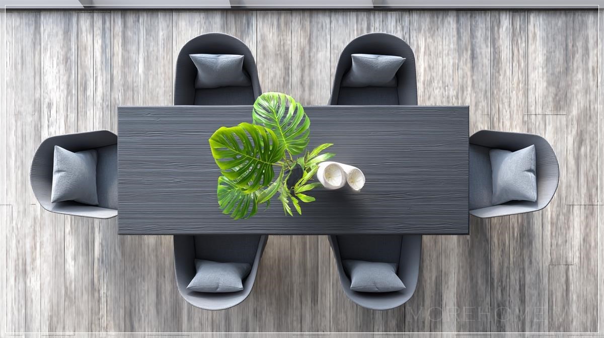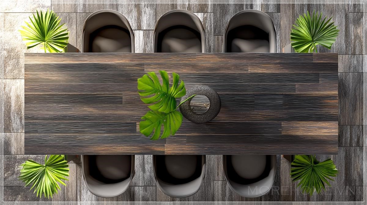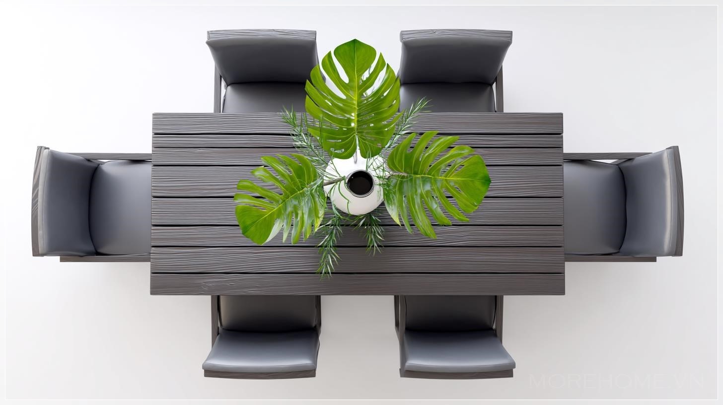 Được thiết kế theo phong cách hiện đại, bàn ăn gỗ tự nhiên với màu sắc trắng xám thanh lịch kết hợp cùng những chiếc ghế đương đại tạo nên một không gian hoàn hảo cho các buổi tiệc hay những bữa ăn gia đình. Bàn ăn hình chữ nhật với bề mặt bằng gỗ sồi đen sang trọng, kết hợp với chiếc bình trang trí chứa lá monstera xanh mướt, mang lại một vẻ đẹp hài hòa, đầy sức sống nhưng cũng không kém phần quý phái. Bàn ăn này không chỉ là một món đồ nội thất mà còn là một tác phẩm nghệ thuật tinh xảo trong không gian sống của mỗi gia đình.