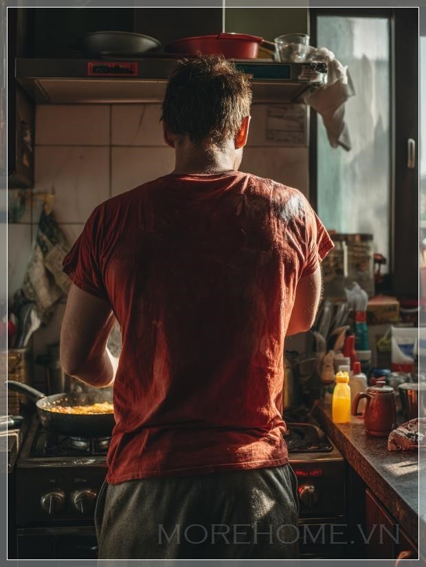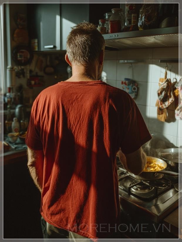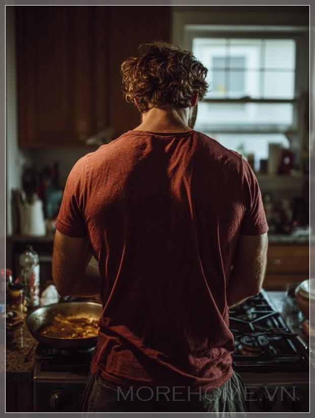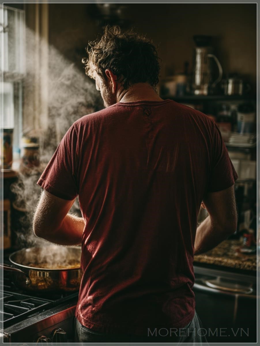 Trong một không gian bếp hiện đại, nơi ánh sáng tự nhiên chiếu qua cửa sổ, một người đàn ông mặc áo phông đỏ đang đứng trước bếp. Cảnh tượng này không chỉ là một khoảnh khắc của sự chăm chút trong công việc nấu nướng mà còn là biểu tượng của sự kết hợp hoàn hảo giữa thiết kế tinh tế và hoạt động sống động. Với mỗi bước anh ta thực hiện, không gian bếp trở nên sống động hơn, với ánh sáng đỏ và vàng phản chiếu từ bếp và làn sáng nhẹ nhàng từ cửa sổ. Từng chi tiết trong căn bếp, từ chiếc bếp hiện đại đến ánh sáng chiếu sáng trên chiếc áo phông đỏ của anh, đều tạo nên một hình ảnh siêu thực và tuyệt đẹp.