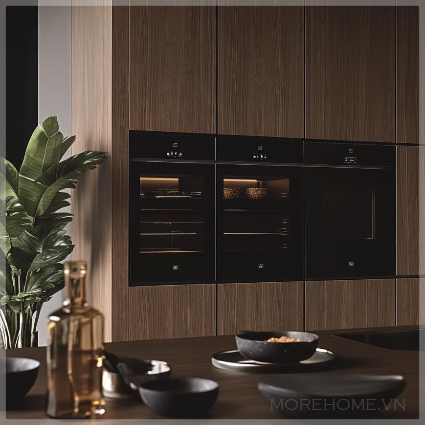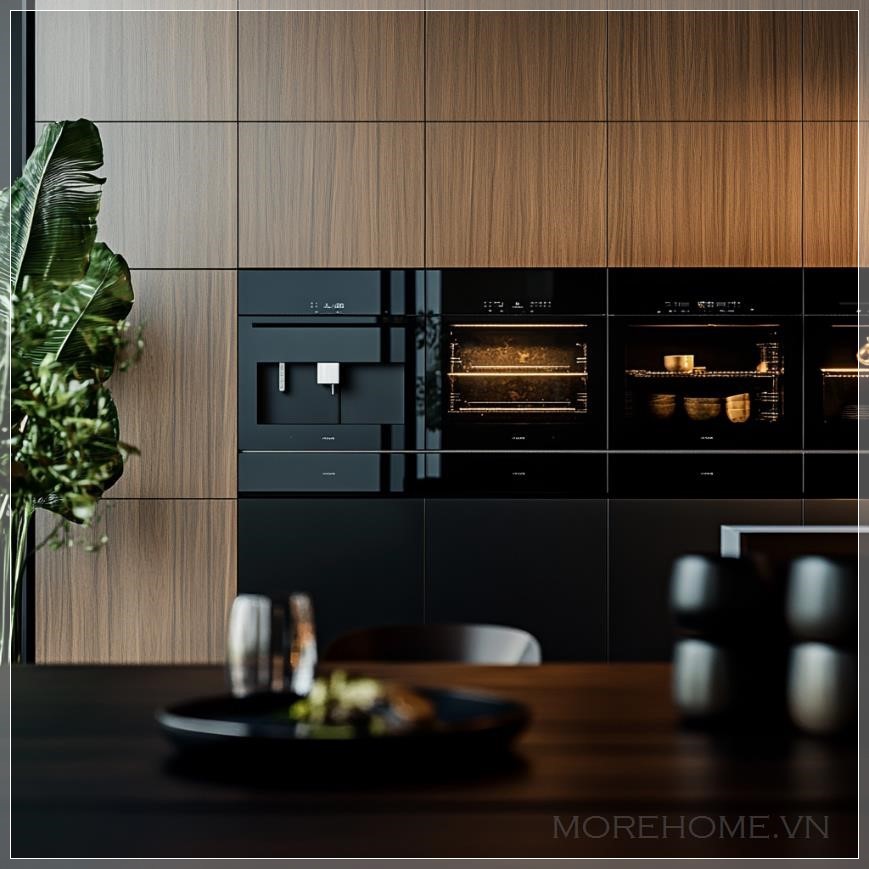Điểm nhấn đầu tiên trong không gian bếp này là những chiếc lò nướng kính đen được tích hợp hoàn hảo vào một bức tường gỗ. Các lò nướng cao cấp không chỉ có thiết kế sang trọng mà còn sở hữu màn hình kỹ thuật số hiện đại, giúp người sử dụng dễ dàng điều chỉnh các chức năng mà không làm mất đi vẻ đẹp liền mạch của không gian. Bề mặt kính đen phản chiếu ánh sáng, tạo ra những hiệu ứng ánh sáng mềm mại, góp phần làm nổi bật vẻ đẹp của từng chi tiết trong bếp. Mọi chi tiết đều được thiết kế để tối giản, nhưng lại toát lên sự tinh tế, nhấn mạnh sự kết hợp hoàn hảo giữa chức năng và thẩm mỹ.