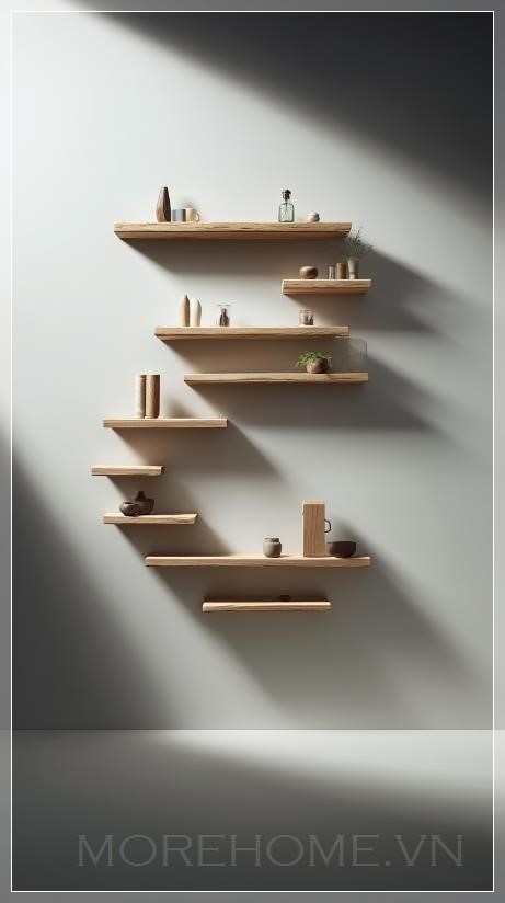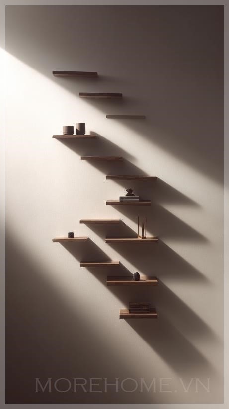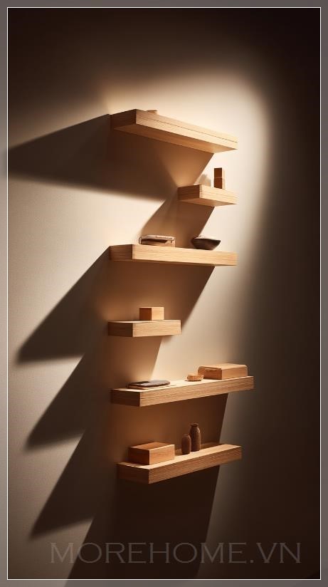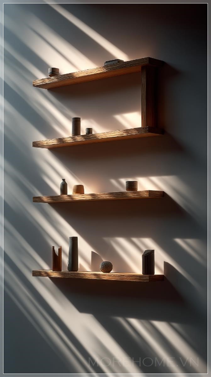 Với thiết kế kệ gỗ hình số 51, việc sử dụng những thanh gỗ được xếp đặt tỉ mỉ trên một bức tường sạch sẽ, tạo thành một hình khối rõ ràng mang lại cảm giác mạnh mẽ nhưng không kém phần thanh thoát. Dưới tác động của ánh sáng mạnh từ góc trên bên trái, những bóng đổ dài và rõ ràng tạo ra hiệu ứng ánh sáng IES, khiến cho không gian trở nên sâu lắng và đầy tính nghệ thuật. Đây là một thiết kế phù hợp cho những ai yêu thích sự tối giản nhưng vẫn muốn mang đến một nét đặc biệt cho không gian sống của mình.