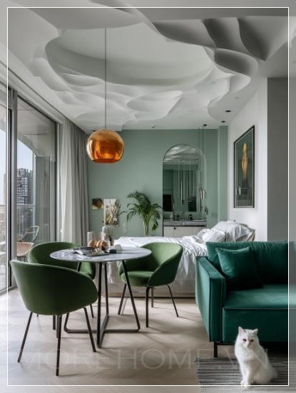 Một trong những đặc điểm nổi bật của căn hộ này là sự pha trộn giữa những màu sắc sáng và sự thoải mái của các món đồ nội thất. Chiếc giường, sofa và bàn ăn nhỏ đều có thiết kế đơn giản nhưng lại rất tinh tế, mang đến không gian sống thoáng đãng và dễ chịu. Đặc biệt, chiếc ghế sofa mềm mại với thiết kế tối giản cùng với bàn ăn nhỏ gọn và hai chiếc ghế dinh dưỡng cho không gian thêm phần hài hòa. Màu sắc chủ đạo là trắng, tạo cảm giác sạch sẽ và rộng rãi. Những điểm nhấn là các vật dụng trang trí nhỏ, như chú mèo trắng đáng yêu, mang lại sự sinh động và gần gũi cho không gian.