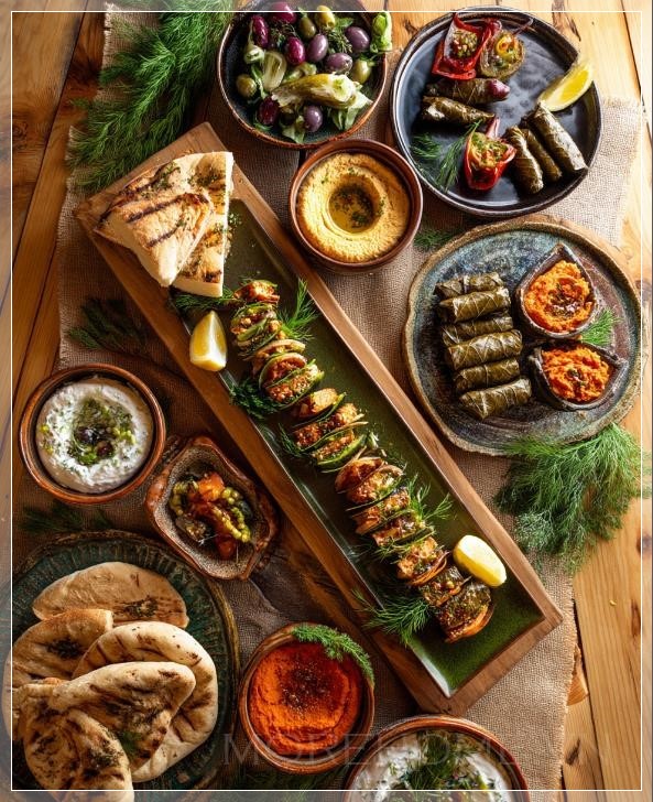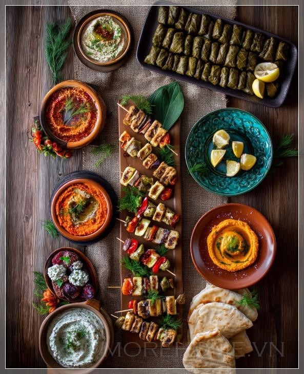 Điều đặc biệt của bàn ăn này chính là cách các món ăn Địa Trung Hải được sắp xếp một cách hoàn hảo. Từ những chiếc lá nho nhồi (Dolma) với lát chanh tươi và ngò rí, cho đến món Muhammara (món dip ớt nướng và quả óc chó) kết hợp cùng bánh pita giòn tan. Mỗi món ăn không chỉ mang hương vị đặc trưng của khu vực mà còn được nâng tầm như một tác phẩm nghệ thuật nhờ vào cách trang trí cẩn thận, bắt mắt. Từng món ăn, từng chi tiết được chăm chút tỉ mỉ tạo nên một bức tranh sinh động và đầy hấp dẫn.