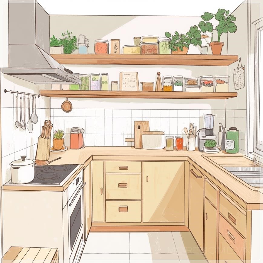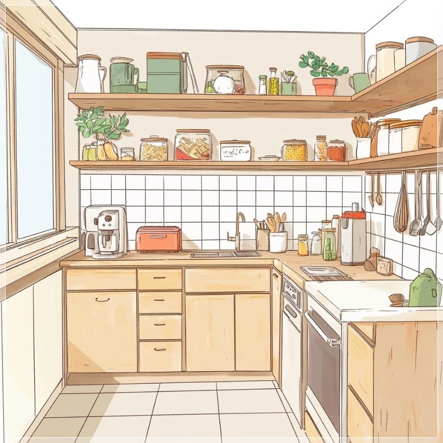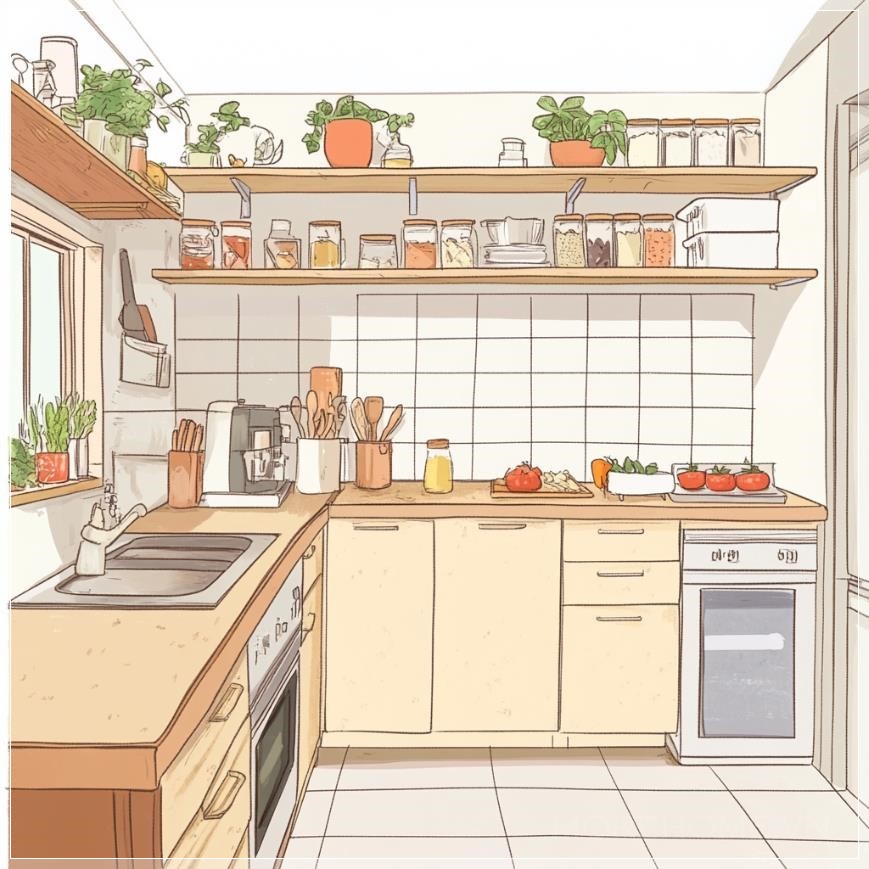 Bếp theo phong cách "slice of life" với chủ đề hoạt hình mang đến một cảm giác dễ chịu, đầy màu sắc. Từng chi tiết trong không gian bếp như những chiếc tủ đựng đầy nguyên liệu tươi ngon hay các dụng cụ nhà bếp được sắp xếp gọn gàng, tạo nên một không gian sạch sẽ và đầy sức sống. Đặc biệt, các tủ kệ trong bếp được trang trí bằng các chi tiết nhỏ nhắn, dễ thương như những chú búp bê xinh xắn, mang lại cảm giác như bước vào một thế giới tưởng tượng, nơi mọi thứ đều hoàn hảo và ngọt ngào.