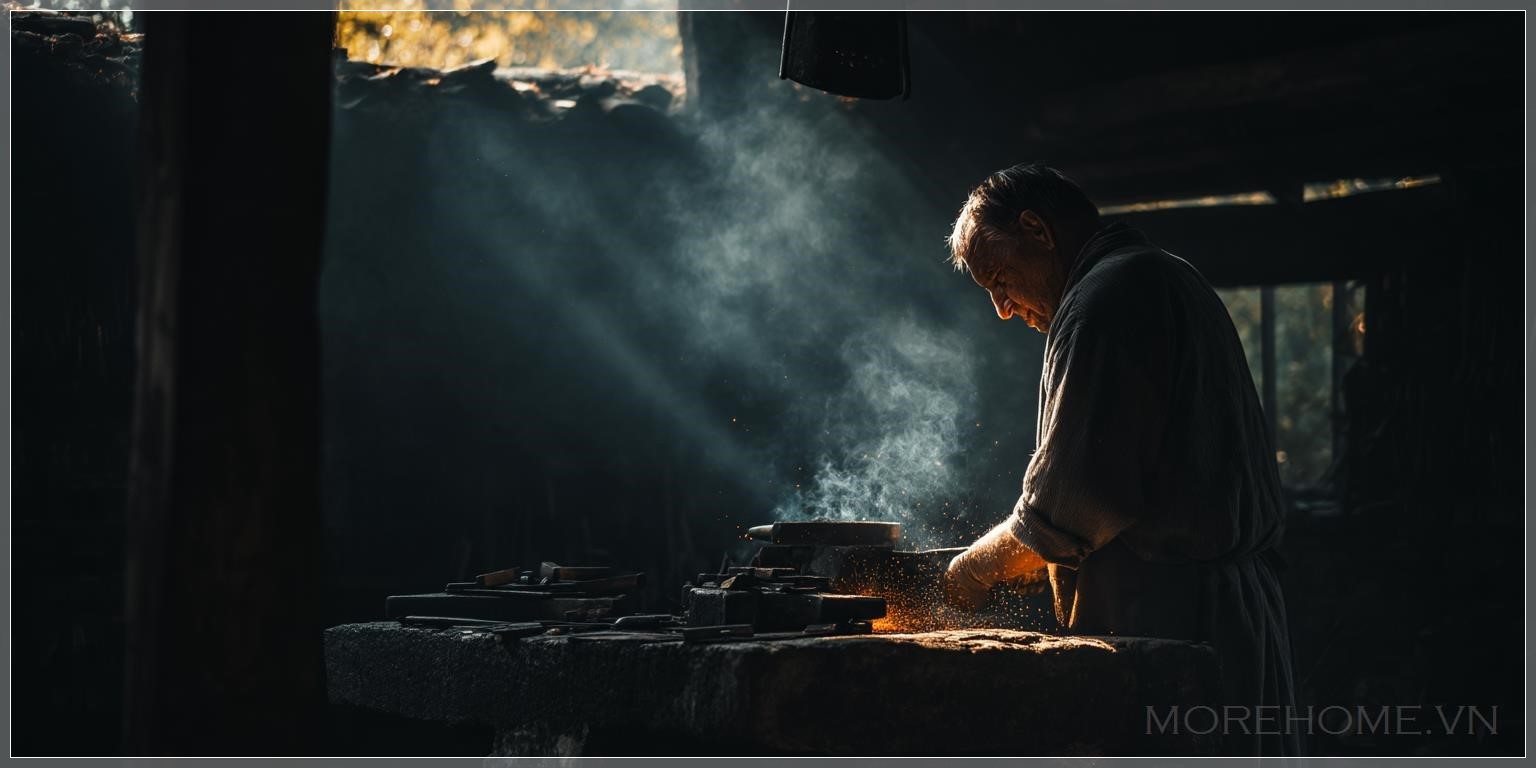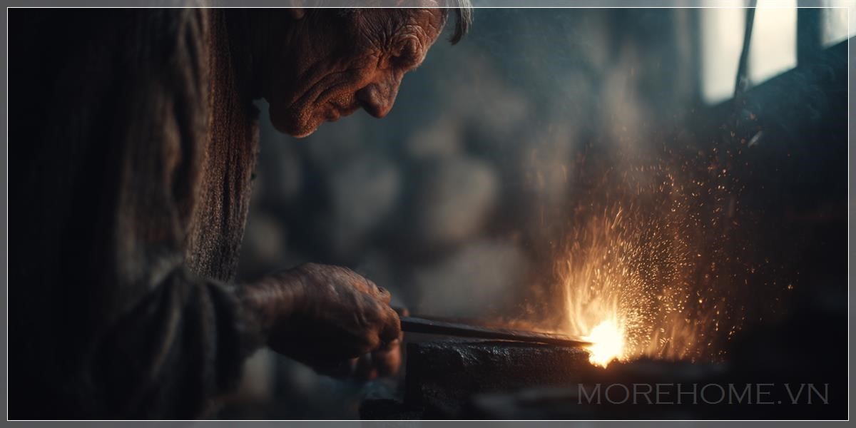 Trong thế giới của nghệ thuật và sáng tạo, có những khoảnh khắc mà vẻ đẹp của quá khứ hòa quyện cùng sự tôn vinh sức mạnh và sự tinh tế. Một trong những hình ảnh gợi lên cảm giác ấy chính là hình ảnh người thợ rèn chế tác thanh kiếm trong ánh lửa bập bùng của một lò rèn cổ xưa. Đây không chỉ là một quá trình tạo ra một món đồ vật hữu ích mà còn là biểu tượng của sự lao động nghệ thuật, nơi mỗi đường cắt, mỗi nhát đe đều đậm dấu ấn của một nghệ sĩ tài ba. Khung cảnh này không chỉ là một bức tranh sinh động mà còn là biểu tượng của một thời kỳ đã qua, mang trong mình sự hùng mạnh và sự bền bỉ không hề phai mờ theo thời gian.