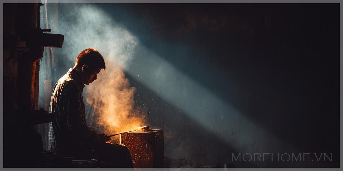 Các yếu tố này tạo nên một bức tranh có chiều sâu và sự sống động, không chỉ nhấn mạnh vào sự lao động vất vả mà còn làm nổi bật lên tính nghệ thuật của một nghề thủ công truyền thống. Mỗi vệt sáng, mỗi tia lửa đều đóng vai trò quan trọng trong việc tạo ra sự tương phản với bóng tối bao phủ không gian. Chính sự đối lập giữa sáng và tối này đã làm nên một không gian đầy kịch tính, mạnh mẽ nhưng không thiếu phần lãng mạn, gợi lên cảm giác về một thời kỳ hùng vĩ nhưng cũng đầy gian khổ.